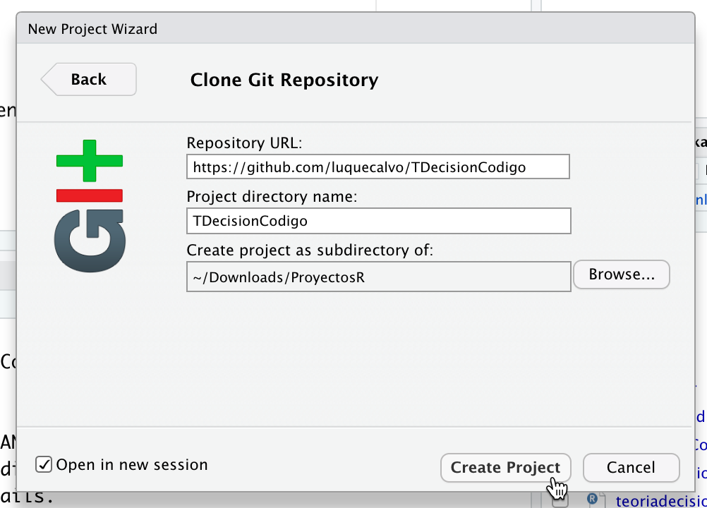 El repositorio que hemos clonado: https://github.com/luquecalvo/TDecisionCodigo (tiene otra url), podemos clonarlo en nuestro ordenador de forma local con ayuda de RStudio. Podremos realizar cambios sobre el código y hacer “git-commit” (confirmaciones) de los cambios, y finalmente hacer un “Push” (subirlo a nuestro repositorio en Github).